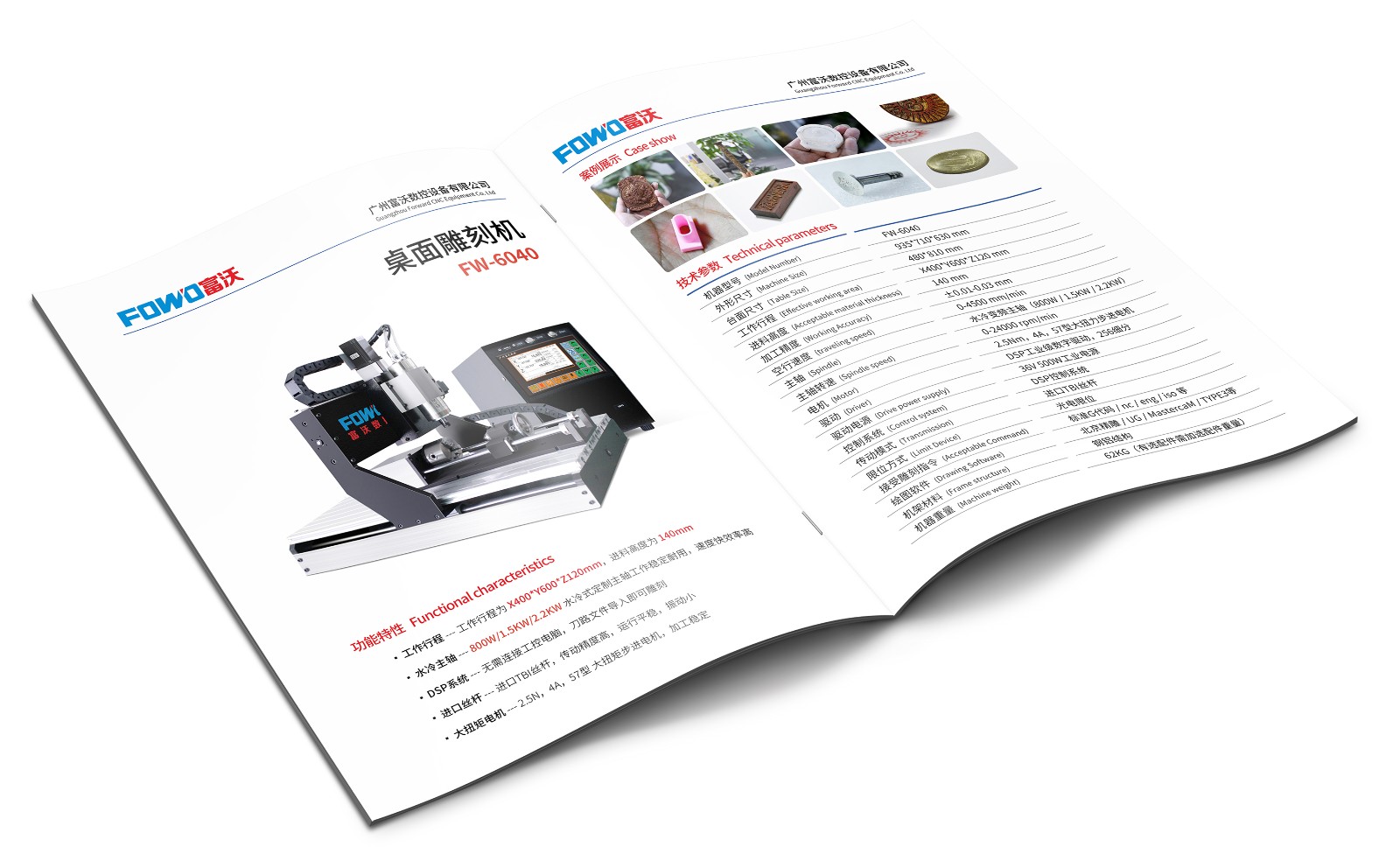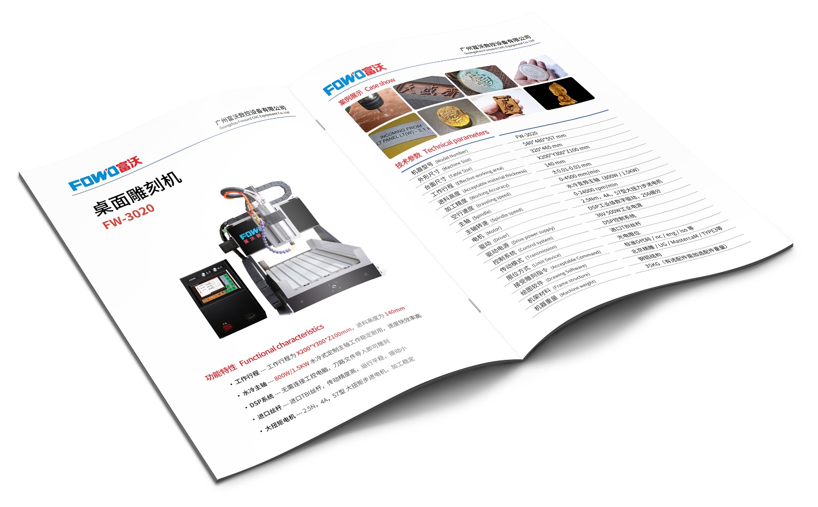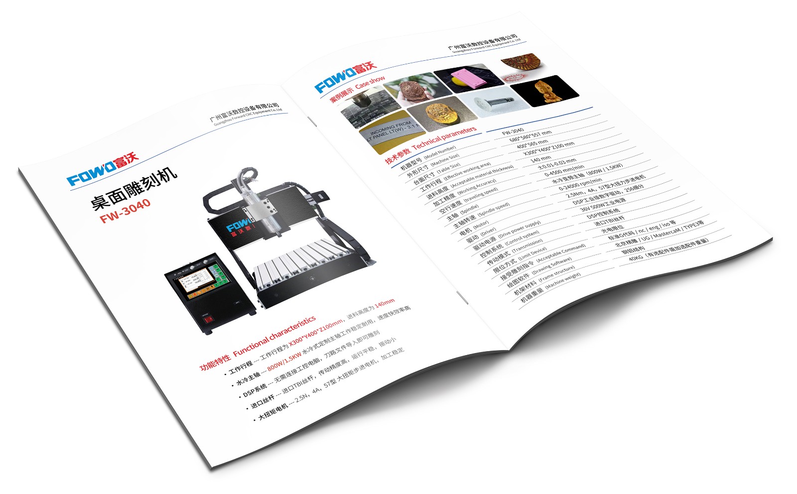 FW-3040:工作行程为X300*Y400*Z100mm,可选配800W/1.5KW的主轴配置(水冷主轴),适用小尺寸工件雕刻,可加装第四轴