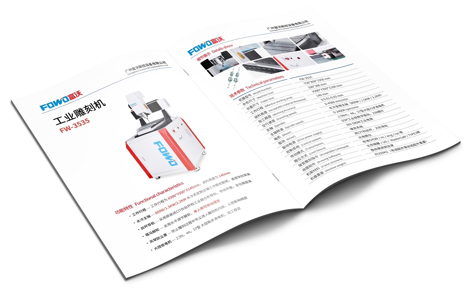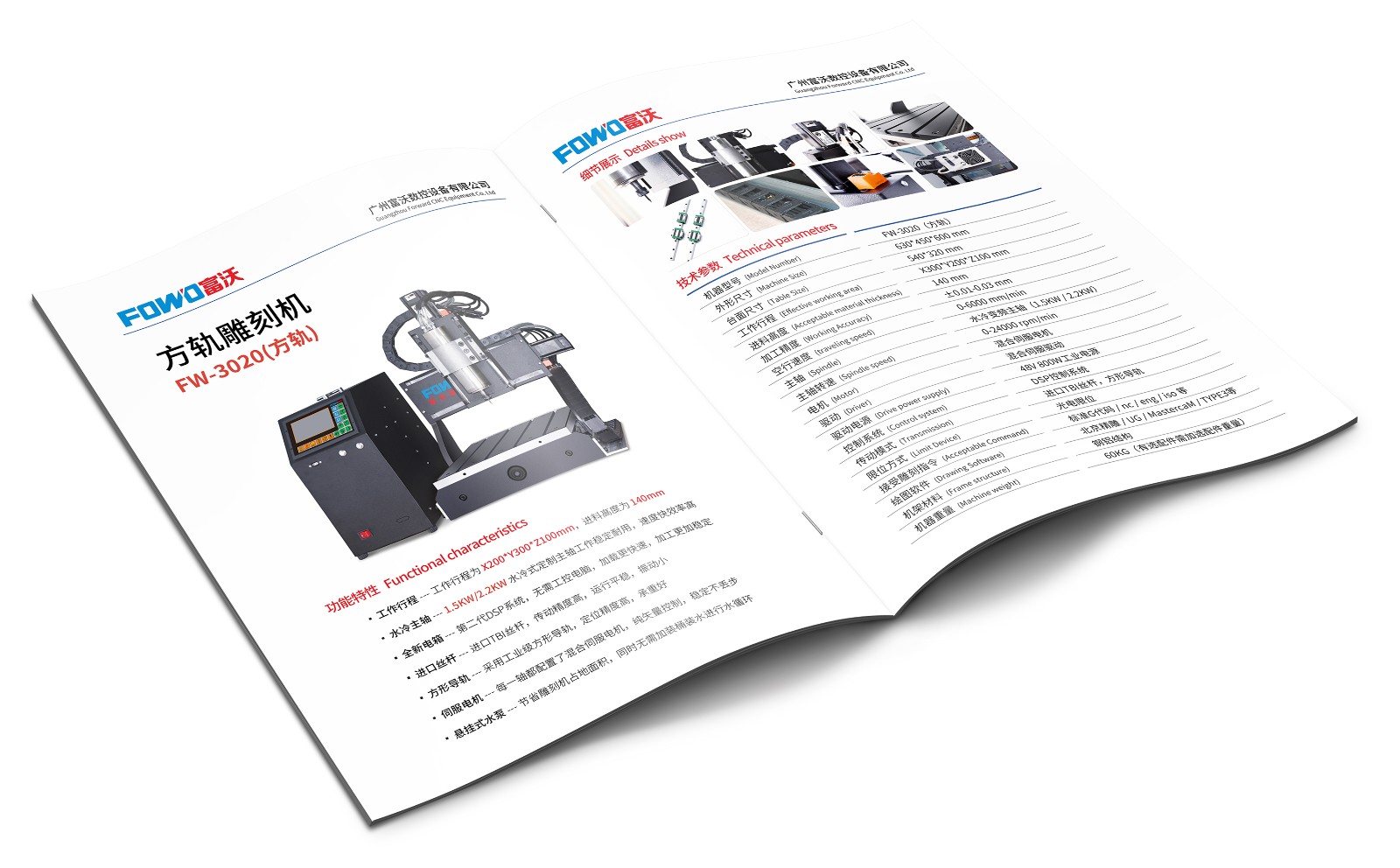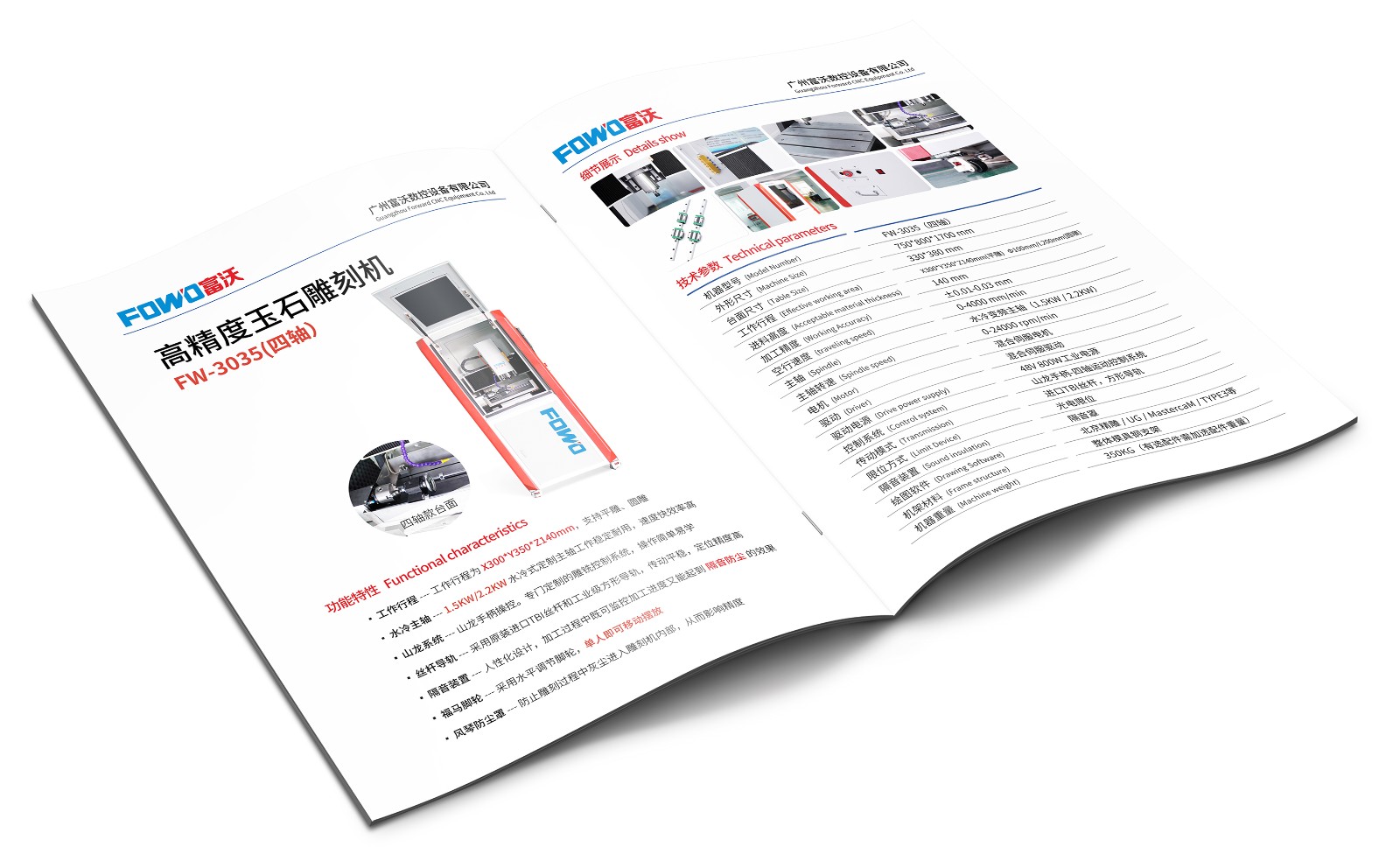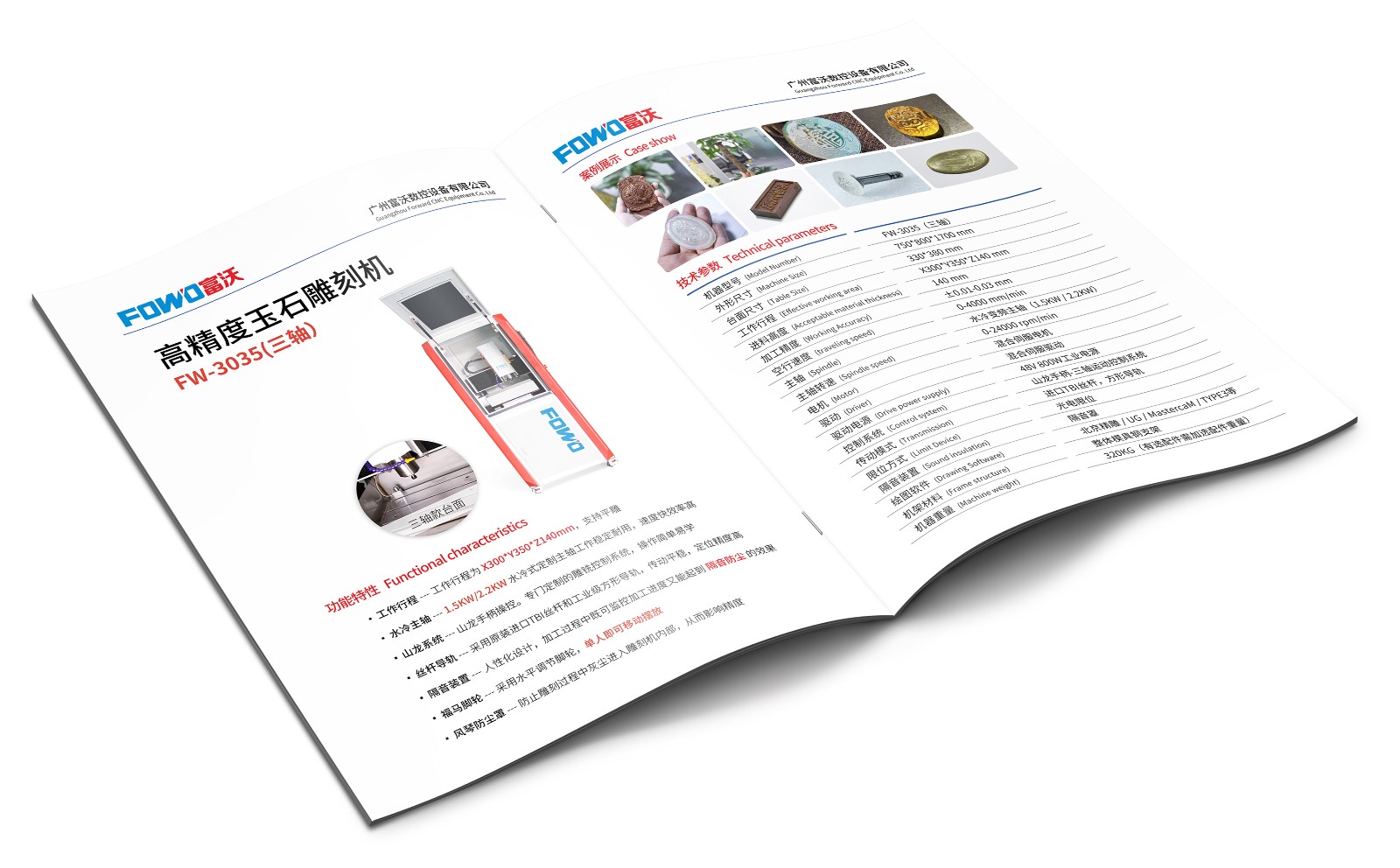 FW-3035:工作行程为X300*Y350*Z140mm,可选配1.5KW/2.2KW的主轴配置(水冷主轴),高精度雕刻机,可加装第四轴,适用玉石、金属平面/立体雕刻,无隔音设计